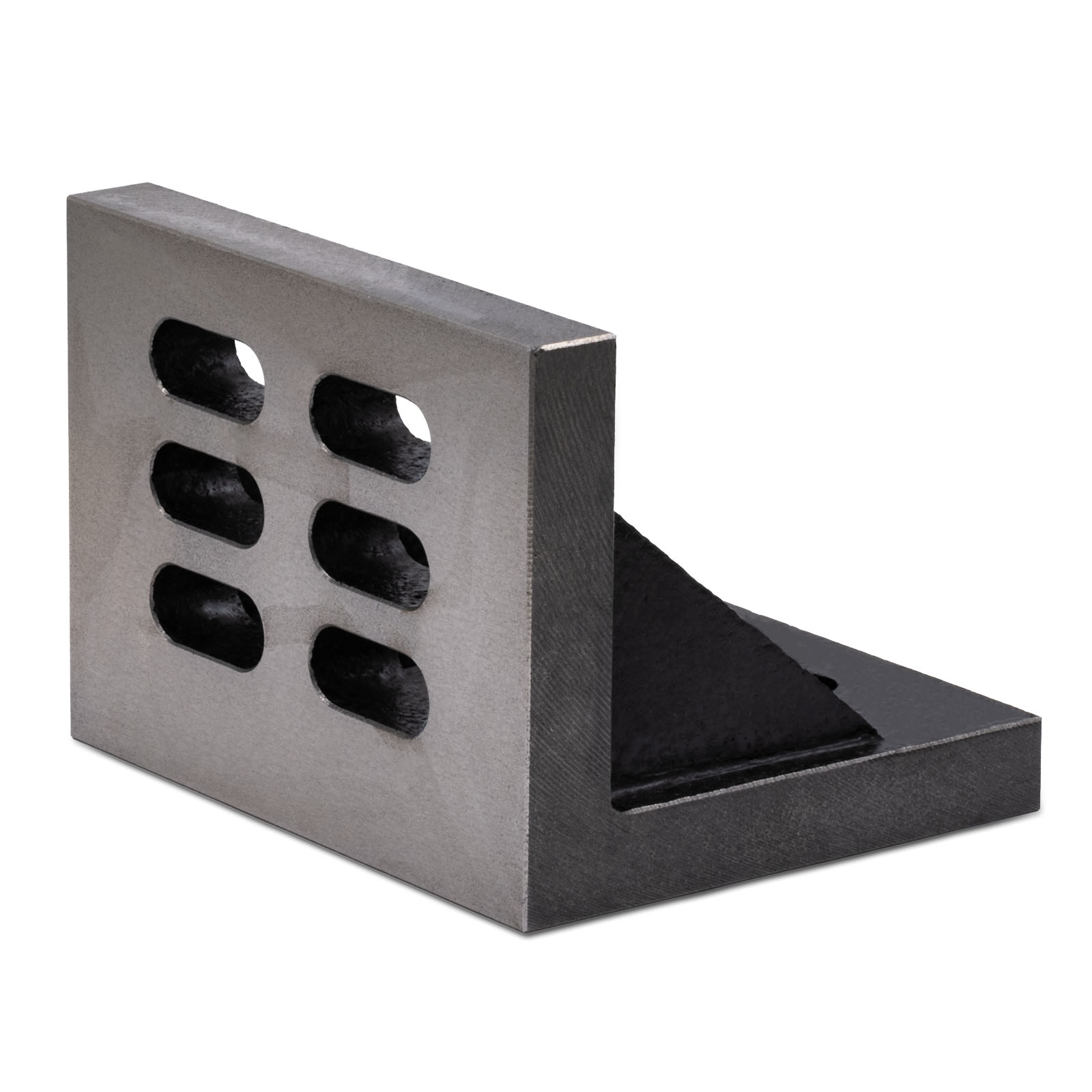 Прецизионная угловая установочная плита (угольник) с 3 вертикальными и 6 горизонтальными пазами изготовленная из высокопрочного чугуна. Все рабочие поверхности прошли прецизионное шлифование, что гарантирует высокую точность и стабильность. Изделие BK-6"-150-100-125 имеет размеры 150x112x125 мм. Его размер и наличие пазов делают его особенно полезным при выполнении точных работ на планшайбе, делительных головках или настольных фрезерных станках, где требуется надежная фиксация и выверенная геометрия.Технические характеристики