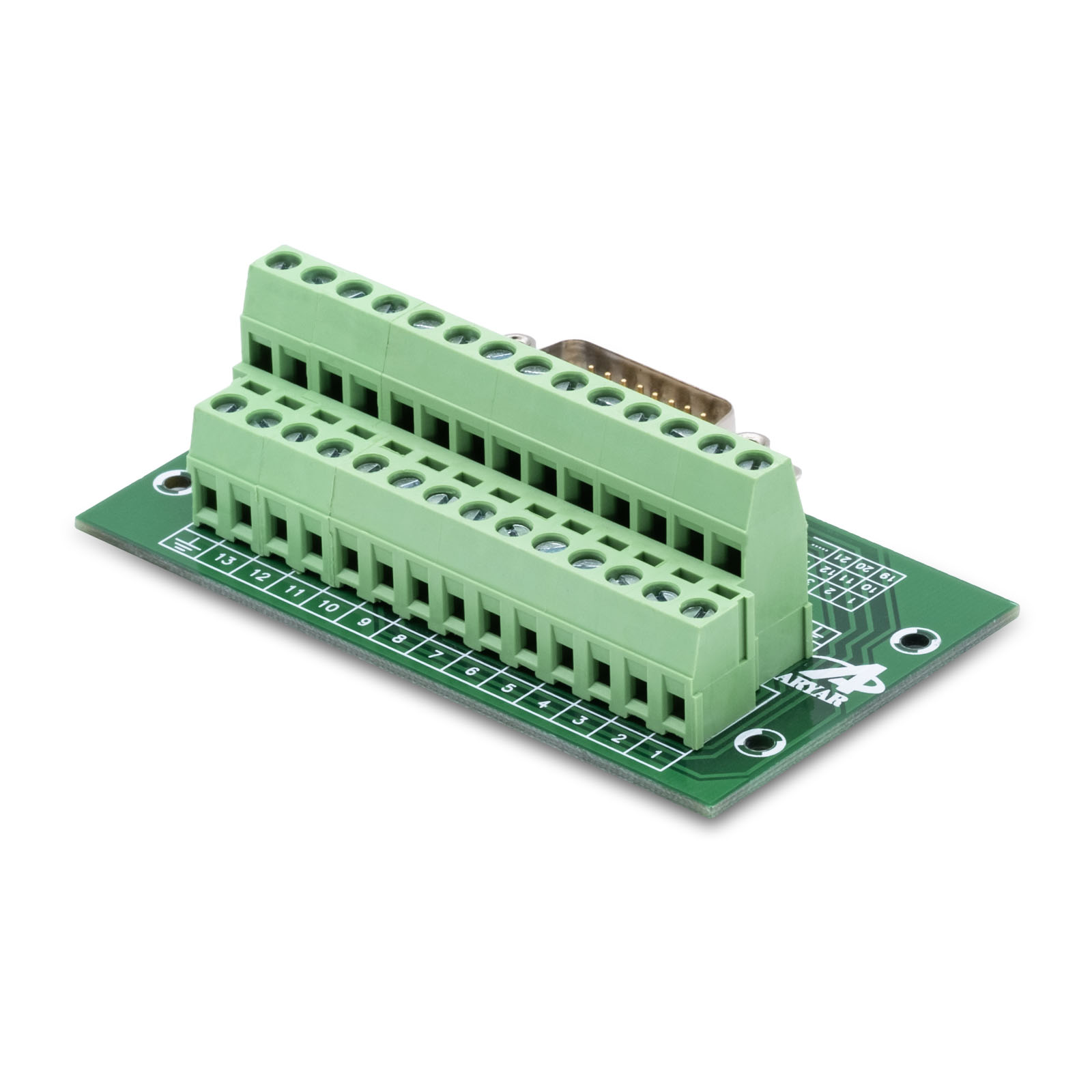 Плата коммутации. Выводит пины кабеля с разъемом HDP25M (папа) на винтовые клеммы для подсоединения кабелей без пайки. Через отверстия платы возможен монтаж креплений на DIN‐рейку.