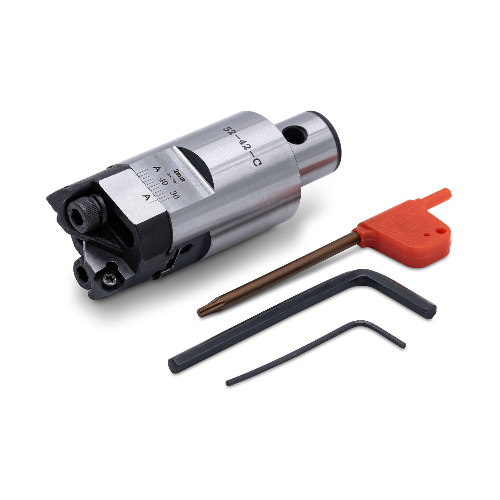 Расточная головка RBH32-42 предназначена для чернового растачивания глухих и сквозных отверстий в диапозоне 32-42 мм и подготовки их для последующей чистовой обработки. Точная регулировка диапазона осуществляется с помощью регулировочного винта с микрометрической шкалой с шагом в 1 мм. Подходит для однокромочной и двухкромочной расточки в зависимости от потребностей обработки. Дополнительное укрепление конструкции позволяет резать до 3-5 мм за один проход. Головка совместима с патрономи LBK. В комплекте идут ключи для настроки и регулоровки держателей пластин, режущие пластины CCMT06** приобретаются отдельно.Технические характеристики