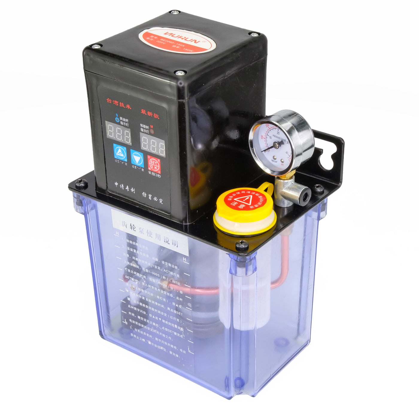 Насос(помпа) оснащен таймером, клапаном для сброса избыточного давления, манометром и резервуаром на 1.5 л. Для создания системы автоматической смазки станка.